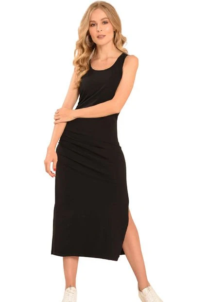 Vestido midi en tejido de punto fondo entero, escote redondo, manga sisa, drapeado lateral, abertura en costado, silueta ajustada.