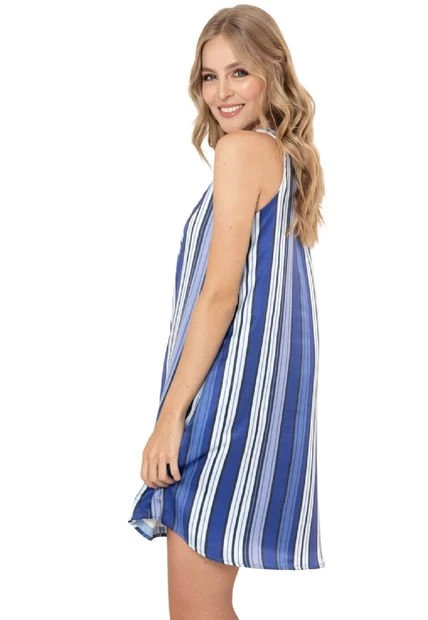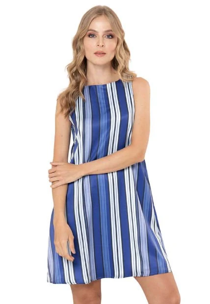 Vestido corto en satin estampado, cuello redondo, manga sisa, linea A, con boton y gotera en espalda.