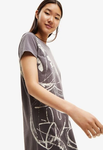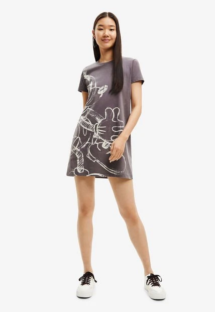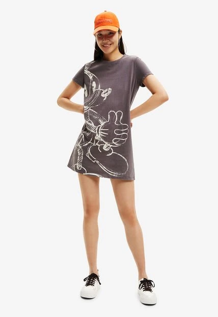 Vestido corto,confeccionado en algodón y con silueta ligeramente evasé. Tiene un efecto desgastado en negro y la silueta de Mickey Mouse, el icónico personaje de Disney, pintada en color blanco y que llega hasta una parte de la espalda.