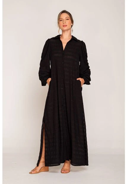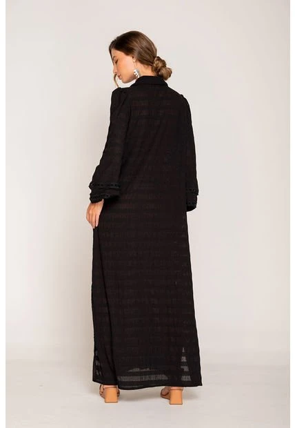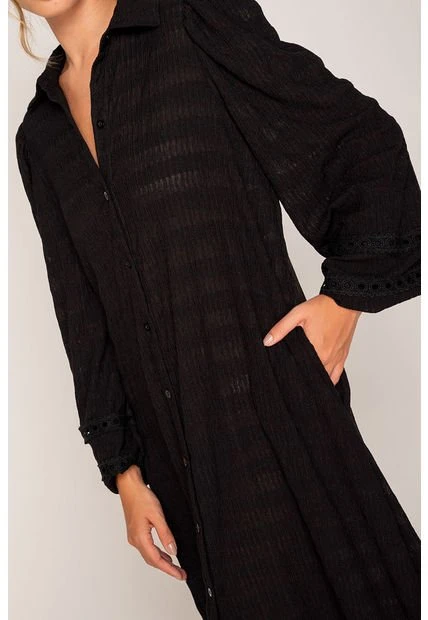 Vestido largo camisero en tejido de punto abierto con textura. Tiene mangas bombachas con guipure en parte inferior, silueta amplia. Es una prenda versátil que puedes usar como kimono y vestido vestido cerrado.