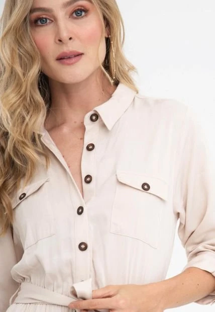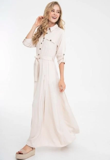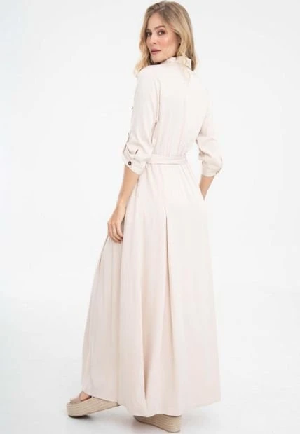 Vestido largo en chalís fondo entero, perilla funcional con botones, bolsillos delanteros y laterales, manga 3/4 con puño y charretera, elástico en cintura, silueta semi ajustada.