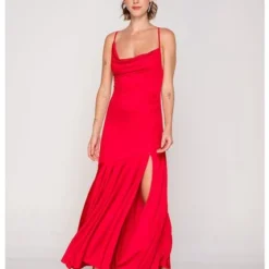 Vestido para mujer largo drapeado, con tiras cruzadas en parte trasera. Silueta ajustada con abertura en delantero que llega hasta el corte asimétrico. Especial para una noche de celebración. Puedes llevarlo con sandalias estilo alpargatas o cuñas de esparto y tendrás un look muy sofisticado.