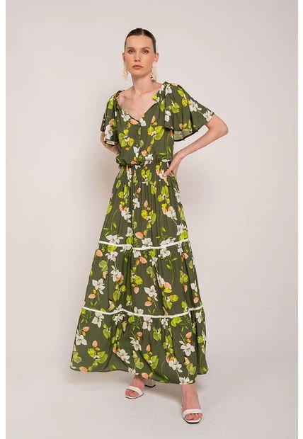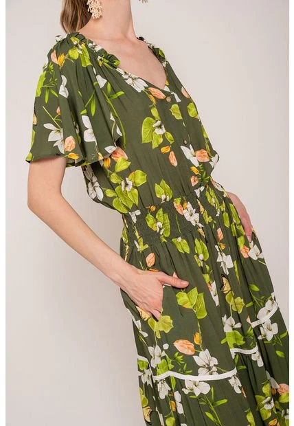 Vestido para mujer largo estampado con nido de abeja en cintura y botonadura en el centro frente, cuello en V con recogido en los costados y manga corta en gola. Este vestido tiene cortes con vivos en contraste en la falda. Una prenda ideal para tus fines de semana. Un par de tacones, sandalias o plataformas de un solo color y que tengan algún detalle brillante, ¡Te harán lucir hermosa!