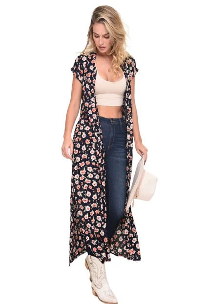 Vestido largo en chalis estampado, cuello nerú, perilla completa con botones, manga corta rodada co guardapolvo, pasadores y cinturón, bolsillos laterales y abertura laterales.
