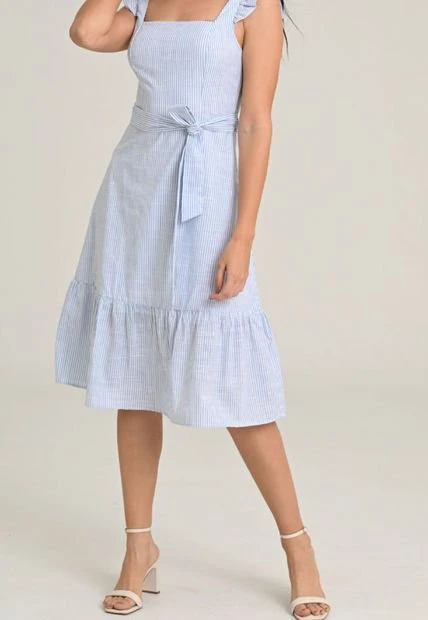 Vestido largo midi en tafetán rayas, escote cuadrado, tirantes con bolero, corte en cintura y pasadores, cinturón en la misma tela, cierre en costado, bolero en ruedo, forro interno en chalis fondo entero. RAGGED es una empresa competitiva y sólida que cuenta con más de 30 años de experiencia con su propuesta de diseño y moda,