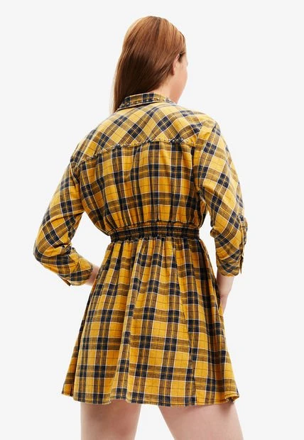 Vestido corto camisero, confeccionado en algodón, con estampado de cuadros en colores mostaza y negro, con botones snap y cintura fruncida. Cuello cutaway, Cierre de botones