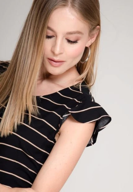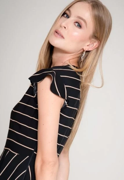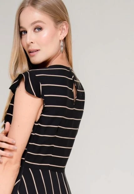 Vestido corto en chalis estampado rayas, escote redondo con abertura en espalda y botón, manga corta con vuelo, corte en cintura, cierre en costado, forro interno en chalis fondo entero. RAGGED es una empresa competitiva y sólida que cuenta con más de 30 años de experiencia con su propuesta de diseño y moda,