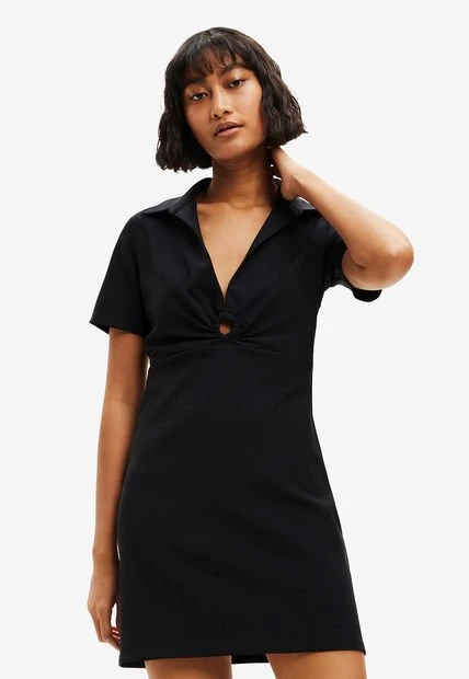 Este vestido corto, con cuello camisero, tiene un corte retro un poco evasé y muy favorecedor. Además tiene detalles como el fruncido debajo del pecho.