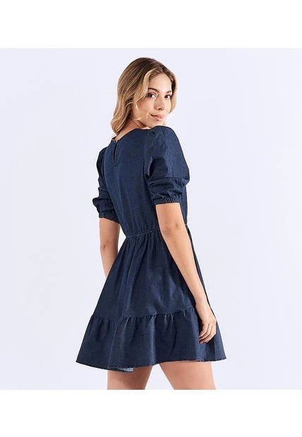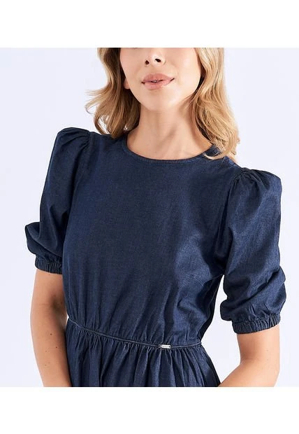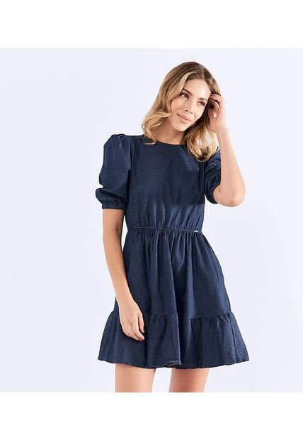 Descripción del producto: vestido dama chambray manga bombacha. escote redondo, corte a la cintura y falda con cortes escualizados.
