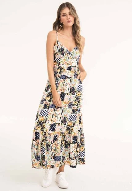 Vestido en chalís estampado, de tiras, escote en V, ajusta en cintura y busto, detalle de amarre con sesgo en espalda, bolsillos laterales, falda larga con bolero en ruedo.