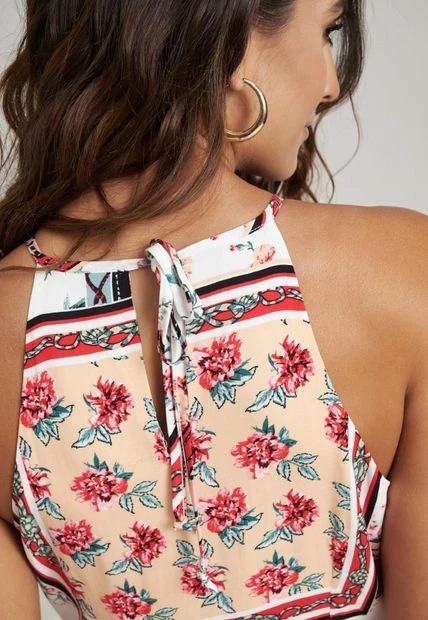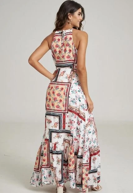 Vestido largo en chalis estampado, escote halter, manga sisa, forro interno en chalis fondo entero. RAGGED es una empresa competitiva y sólida que cuenta con más de 30 años de experiencia con su propuesta de diseño y moda,