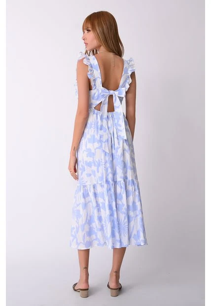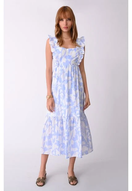Vestido largo color blanco con flores azules estampadas referencia FLORINDA.