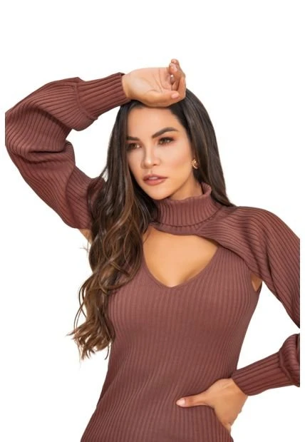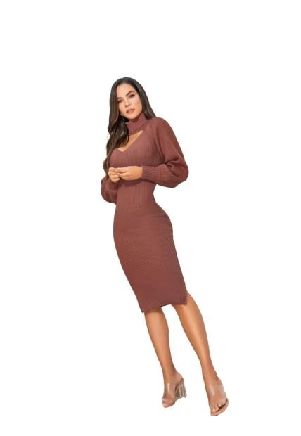Vestido en hilo con tejido de punto, manga larga, color terracota,de silueta ajustada (Básica + manguitos de punto) .