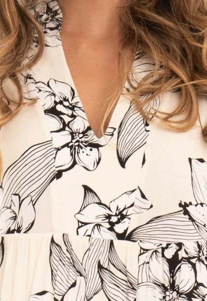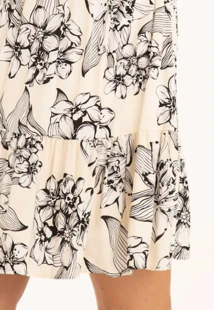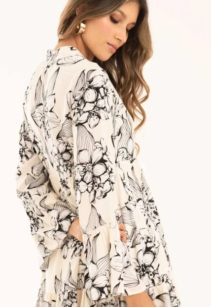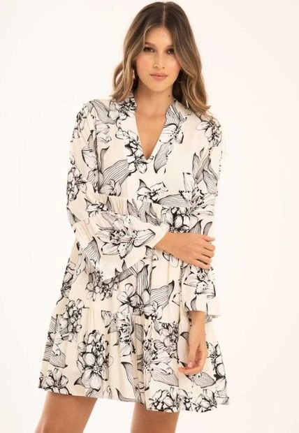Vestido corto en chalis estampado, cuello nerú con escote en V, corte en cintura, manga larga amplia, bolero en ruedo, forro interno en chalis fondo entero.